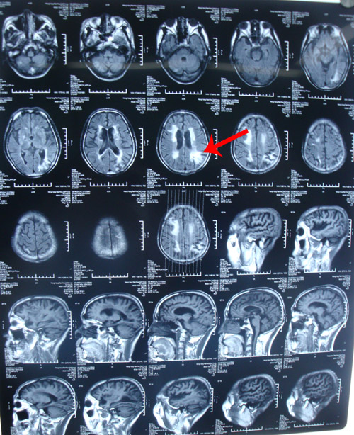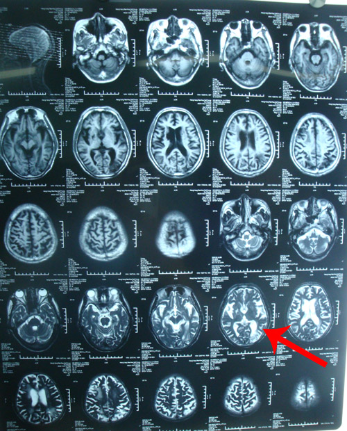 南华大学附一院头颅MRI示:左枕叶内异常信号,考虑脑梗塞可能性大。
