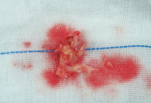 图为术中从患者的右侧颈内动脉取出的病变斑块