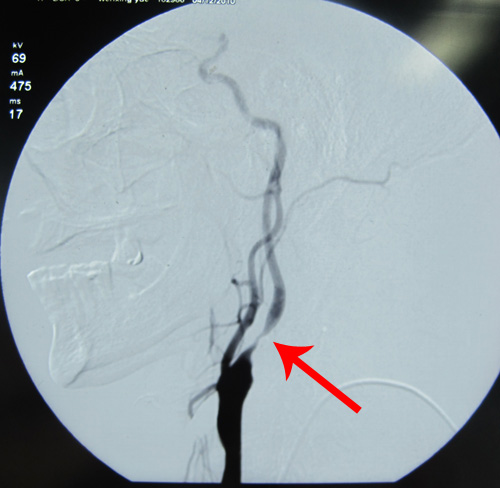 DSA示:左侧颈内动脉分叉部位重度狭窄,狭窄率约为80%。