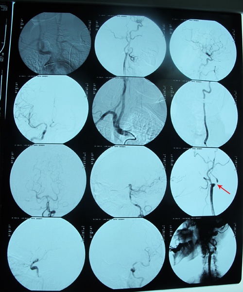患者一:高某某,男,75岁间断右手活动不灵20余天。患者于20余天前无明显诱因突发右手活动不灵,随后被家属送入院,入院后尚未经治疗后逐步缓解。近来此种情况多次发作。经头部CT检查提示:脑内多发腔隙性脑梗死。DSA示:双侧颈内动脉分叉部位狭窄,以左侧为著。门诊以“双侧颈内动脉狭窄、多发性脑梗塞”收治入院,病程中给予阿司匹林及阿托伐他汀治疗。