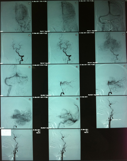 DSA(2011-3-21,人民医院):双侧颈内动脉起始部及右颈内动脉虹吸段及右侧大脑后、小脑上动脉起始段多发动脉硬化斑块形成,伴不同程度的管腔狭窄。