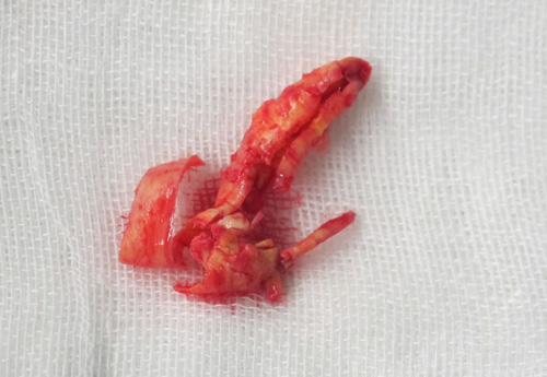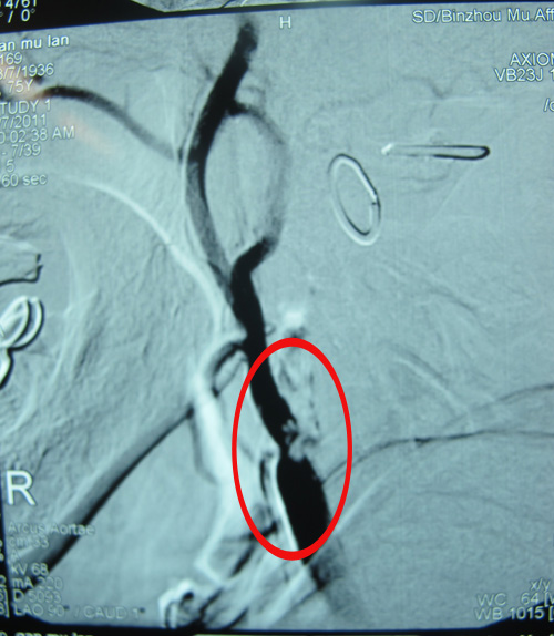 该患者TIA症状(发作性左上肢乏力、抖动)频繁发作1年,且有加重趋势,患者合并糖尿病、冠心病等危险因素。DSA检查示:双侧颈动脉狭窄。符合CEA手术指征。2011年3月29日,协作组张勤奕教授与安贞医院欧阳川教授应邀前往青岛顺利为其实施了右侧颈动脉内膜剥脱术。目前患者情况稳定,待恢复3个月左右再为其实施左侧手术。