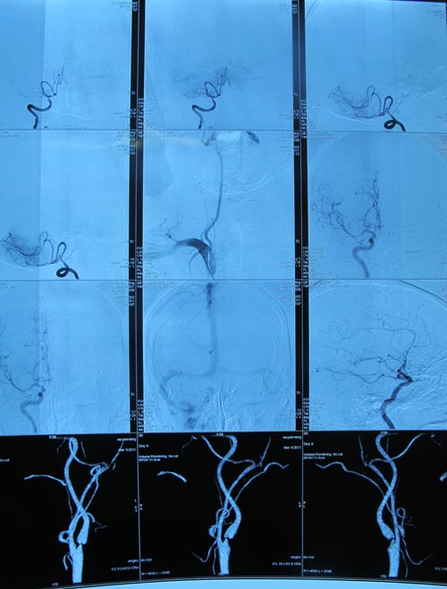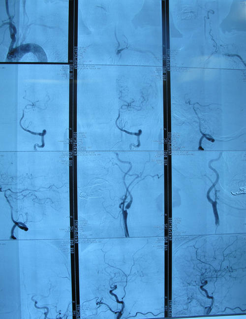 脑血管造影(2011-3-9):头臂干、左颈总动脉、左锁骨下动脉开口未见异常。左侧颈内动脉起始部狭窄,最狭窄处约90%。造影剂呈细线样通过,边缘尚光滑,颅内各级分支血管分布均匀,未见血管畸形、动脉瘤及血管狭窄等异常征象。左椎动脉造影有大脑后动脉未见显影,基底动脉显示良好,左侧大脑前、大脑中动脉显影。右颈内动脉显示良好,右颈内动脉造影见后交通动脉显示良好,右大脑后动脉显示良好,未见明显狭窄、动脉瘤、动静脉畸形等异常征象,也未见占位征象。右椎动脉造影见基底动脉未显影,只显示右侧小脑后下动脉,其余均未显示