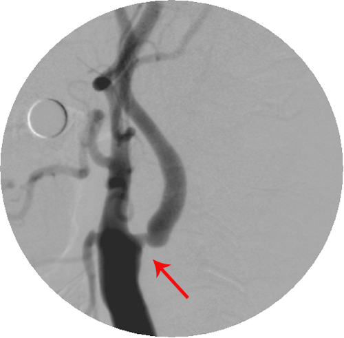脑血管造影(广水市第一人民医院):右侧颈内动脉起始段重度狭窄,左侧颈内动脉起始段轻度狭窄。