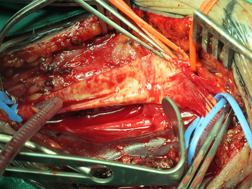 患者二:男,53岁,因右侧肢体无力一周入院。高血压病史5年,脑梗塞病史5年,心肌梗塞病史4年。头颈部CTA示左侧颈内动脉闭塞。拟行颈动脉闭塞再通术。但术中从患者的左侧颈内动脉剥除大量血栓后,经探测远端仍无法再通,遂实施颈内动脉残根切除术。