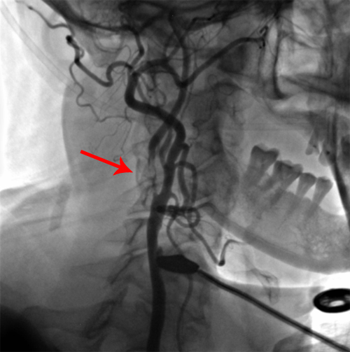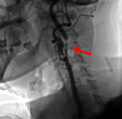 患者2年前无明显诱因出现头晕、言语不利,伴视物旋转、恶心、呕吐。在当地医院就诊,完善头颅CT示陈旧性脑梗塞。血管超声示双侧颈动脉硬化伴狭窄,给予药物治疗后好转。半年前患者再次无明显诱因出现上述头晕、言语不利等症状,无明显肢体活动障碍,头晕性质基本同前,在上海某医院住院治疗。完善相关检查后诊断为多发脑供血动脉狭窄、高血压病,给予“阿司匹林、波立维、辛伐他汀、压氏达”等药物治疗好转,未遗留后遗症。1周前患者再次出现头晕症状,服用上述药物后头晕症状较前稍缓解。今到北京安贞医院就诊,行血管超声示双侧颈总动脉、双侧颈内动脉中度狭窄,左侧锁骨下动脉轻度狭窄,建议行颈动脉造影检查明确脑供血情况。为进一步诊治以“颈动脉狭窄、冠心病”收入院。