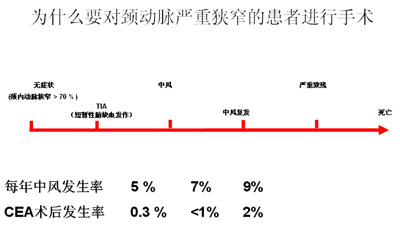在另一项实验中,还发现这项手术对于没有症状,但狭窄程度为60%至99%的患者也是非常有益的。对于这组患者,手术可使估计的5年脑中风危险性降低1半以上,从大约1/10降到不足1/20。