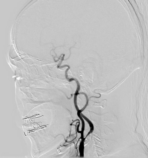 患者5年前因脑梗死曾于安贞医院治疗,当时发现右侧颈动脉狭窄,于天坛医院行右侧颈动脉支架植入术。一周前门诊复查血管超声,发现左侧颈总动脉狭窄,为进一步诊治收入院。全脑血管造影示右侧颈动脉支架血流通畅,右颈外动脉闭塞,左颈内动脉重度狭窄。