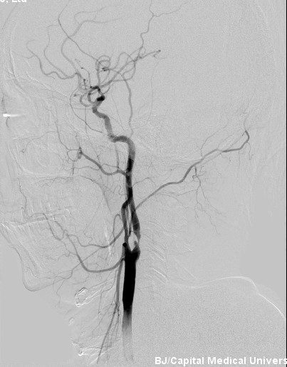 患者3年前于安贞医院体检中心行颈部血管B超检查发现“左侧颈内动脉起始处轻-中度狭窄”,予以口服辛伐他丁、拜阿司匹林等药物治疗。5个前患者复查B超见“左颈内动脉重度狭窄”,为进一步诊治收住院。患者偶有发作性头晕,持续时间不定,既往高脂血症2年,无高血压、糖尿病、冠心病病史。