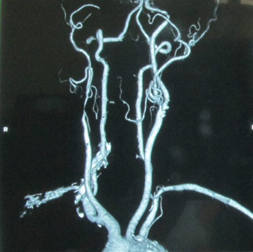 患者2年前突然出现言语含糊不清,伴左侧口角歪斜,能听懂他人的语言,立即就诊于某医院,就诊途中出现左侧肢体无力,左上肢不能抬起,左下肢不能行走,无肢体麻木、抽搐,查头核磁示“脑梗死”,查颈部血管超声提示“右颈内动脉闭塞”,给予抗血小板、康复锻炼等治疗,症状有改善,可自己行走。2011年患者于外院查DSA提示:“右侧颈内动脉闭塞,右侧颈外动脉狭窄,左侧颈内动脉狭窄”。2011年10月31日患者于安贞医院脑卒中中心行右侧颈动脉成形术,为干预左侧颈内动脉狭窄而再次入院。