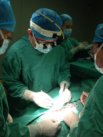 2013年4月12日,张勤奕教授受邀于山西大同同煤总医院,为该患者施行了右侧颈动脉内膜剥脱术,手术顺利,患者恢复良好。
