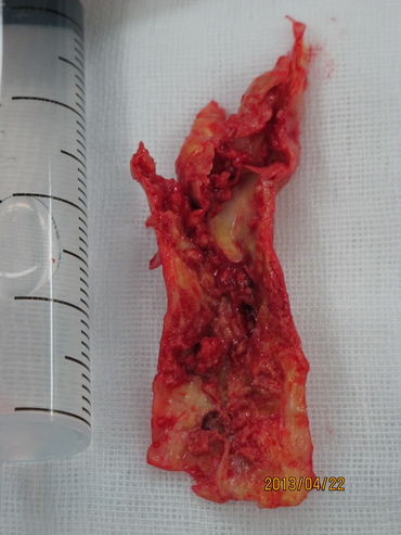 2013年4月22日,张勤奕教授于安贞医院为其施行了左侧颈内动脉内膜剥脱术,术中可见斑块弥漫自颈内动脉至颈总动脉,斑块表面溃疡明显,如豆腐渣样改变。手术圆满成功,患者恢复良好。