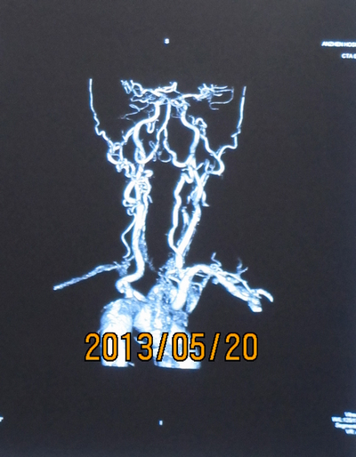 患者一个多月前突然右眼黒曚,持续约3分钟后自行缓解,伴头昏昏沉沉感,持续约数小时缓解,不伴视物旋转、视物成双,不伴肢体麻木无力 、口角歪斜、言语不利,不伴饮水呛咳、吞咽困难。2013年4月11日突然出现右眼视野缺损,右眼视野下半部分缺失,持续约3分钟后自行缓解,伴头晕晕沉沉感,持续约数小时缓解。就诊于当地医院,查颈动脉超声及颈动脉CTA提示双侧颈内动脉重度狭窄。为进一步诊治收住院。