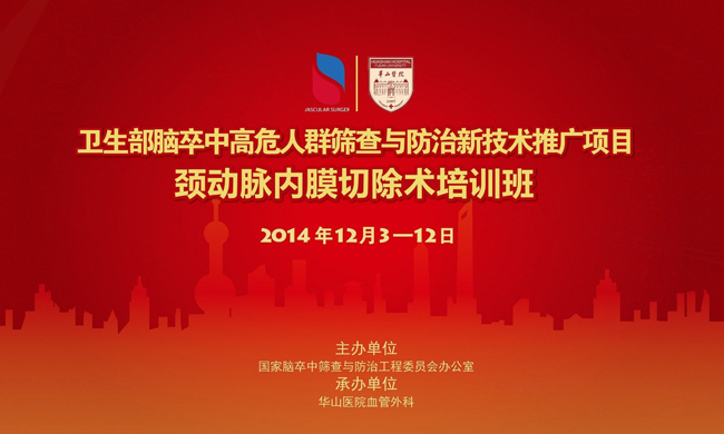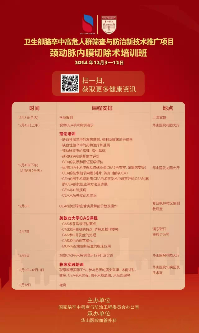 由国家脑卒中筛查与防治工程委员会办公室主办,华山医院血管外科承办的颈动脉内膜切除术培训班,暨国家级医学继续教育项目“第十一期颈动脉硬化狭窄 外科治疗及进展学习班”(项目编号:2014-04-06-004),将于2014年12月3日至2014年12月12日在复旦大学附属华山医院举办。本 次学习班将邀请国内知名血管外科、神经内外科、影像诊断的专家教授系统讲解颈动脉狭窄性疾病领域里国际最新前沿理论知识、最新技术动态和宝贵临床经验并现 场观摩颈动脉内膜切除术及颈动脉支架术手术演示,以及增加了颈部实用解剖操作内容和临床实践内容,将会使学员有更多针对CEA的临床实践机会。