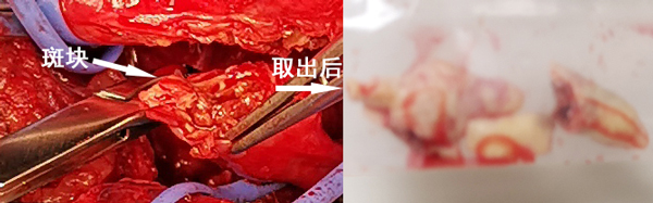 手术过程中,由于张先生左侧颈动脉中有大量斑阻塞血管,并且血管迂曲,所以进行翻转式颈动脉内膜剥脱手术,即:取出斑块,将弯曲的血管下移(1厘米)、拉直、缝合。