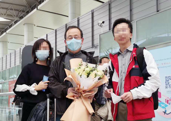 4 月 13 日,历经航班多次取消及改签,张教授终于乘坐北京飞往广州的航班到达几乎无人的广州白云机场,与我儿子碰面。