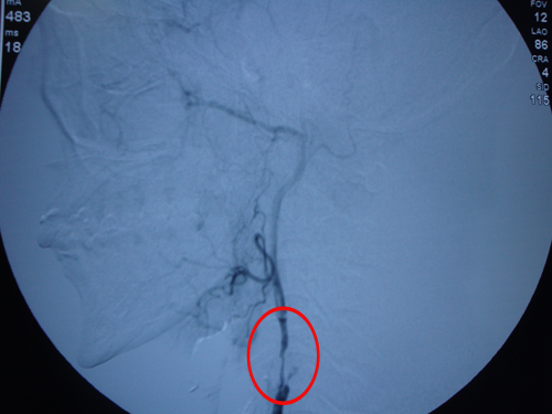 该患者左侧颈内动脉已经闭塞,颈外动脉尚有部分血流通过,故行颈外动脉内膜剥脱术。2010年5月24日,由协作组张勤奕教授、美方组长Douglas医生共同为其实施了左侧颈外动脉内膜剥脱术+血管成形术。