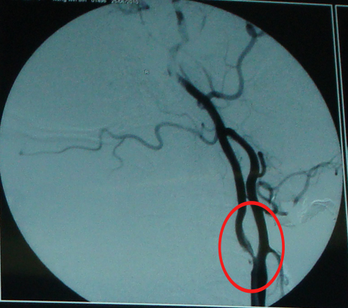 该患者颈内动脉狭窄严重,伴有言语不清(TIA发作),有高脂血症,属高危人群,故符合CEA手术指征。2010年7月4日,由协作组张勤奕教授前往大同同煤集团总医院为其实施了右侧颈内动脉CEA。