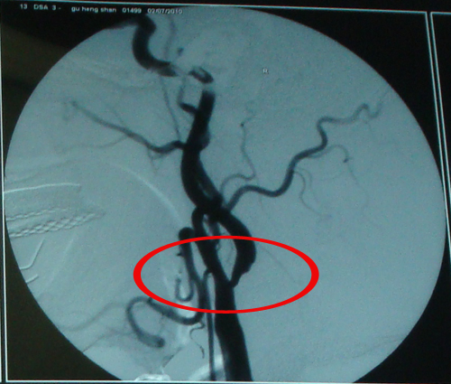DSA示:右侧颈内动脉起始端管腔重度狭窄