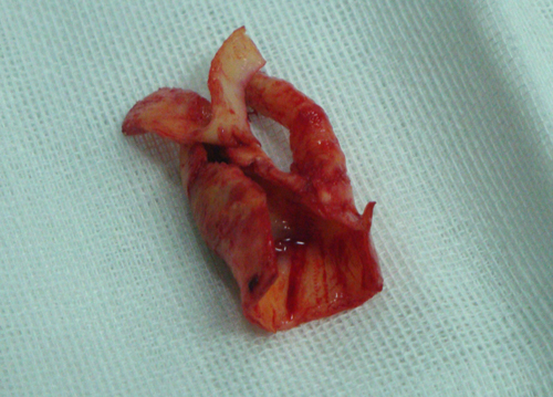 图为术中从患者的右侧颈内动脉取出的斑块