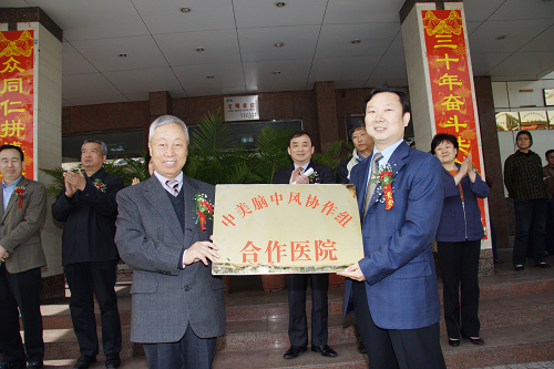 中美脑中风协作组美方副主席王乃栋教授向王改非院长授予该院“中美脑中风协作组合作医院”牌匾。