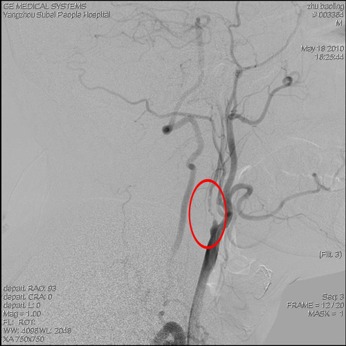 主动脉弓以上血管造影(2010-5-11,本院):动脉粥样硬化改变,左侧颈内动脉近端、左侧椎动脉多发狭窄,椎动脉迂曲。