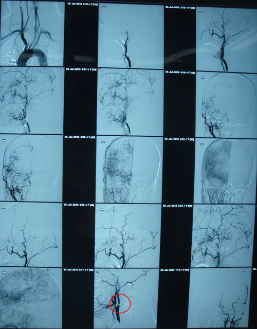 双侧颈动脉超声(2010-7-20,北大人民医院):双侧颈动脉硬化;右侧颈内动脉起始段闭塞;右侧颈外动脉起始段管腔狭窄约为59%;左侧颈内动脉起始段管腔狭窄率约80%以上。