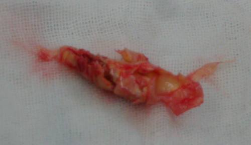 图为术中从患者的颈内动脉中取出的斑块
